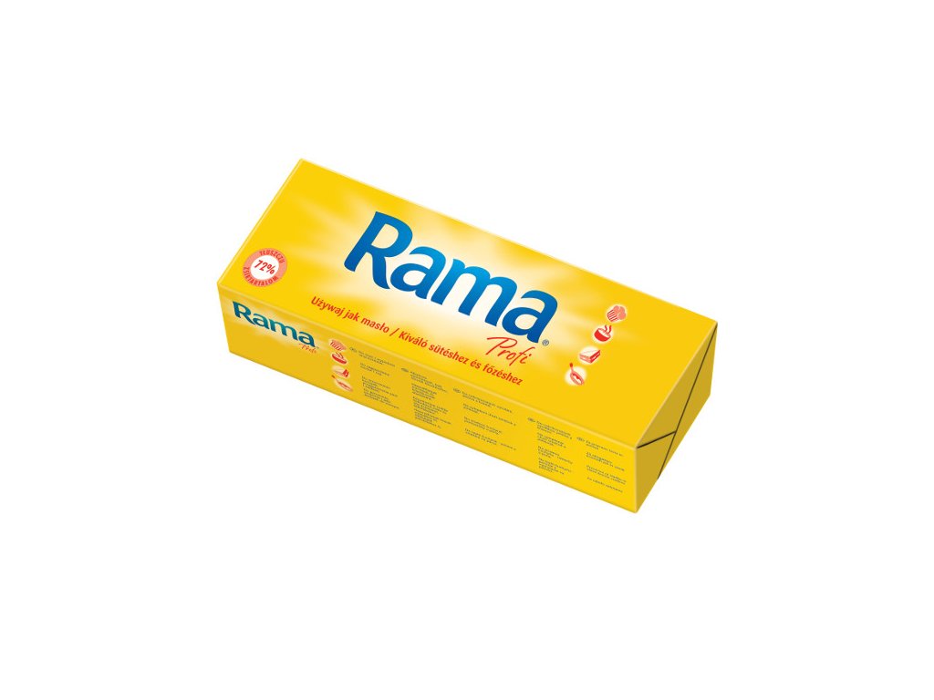 Margarín Rama Profi pro teplou i studenou kuchyni. Rostlinný tuk vhodný pro pekařskou a cukrářskou výrobu.Rostlinné oleje (palmový, řepkový), pitná voda, emulgátory (slunečnicový lecitin, mono- a diglyceridy mastných kyselin), jedlá sůl (0,2 %), regulátor kyselosti (kyselina citronová), aromata,vitamíny (A, D), barvivo (karoteny).