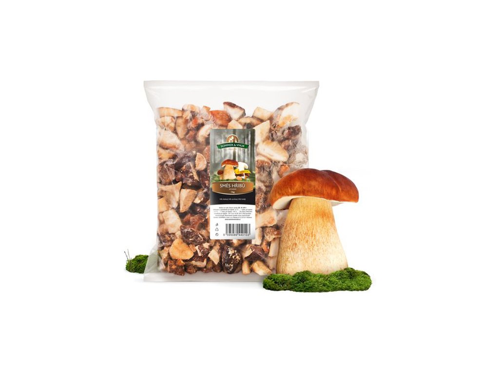 Směs hřibů - plodnice hřibů smrkových a hřibů dubových včetně třeňů, kostky hřibů hnědých bez třeňů.